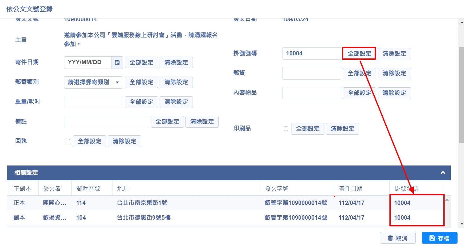 亦可於上方欄位輸入資料後,點選【全部設定】,下方受文者即會整批代入相同的資料。