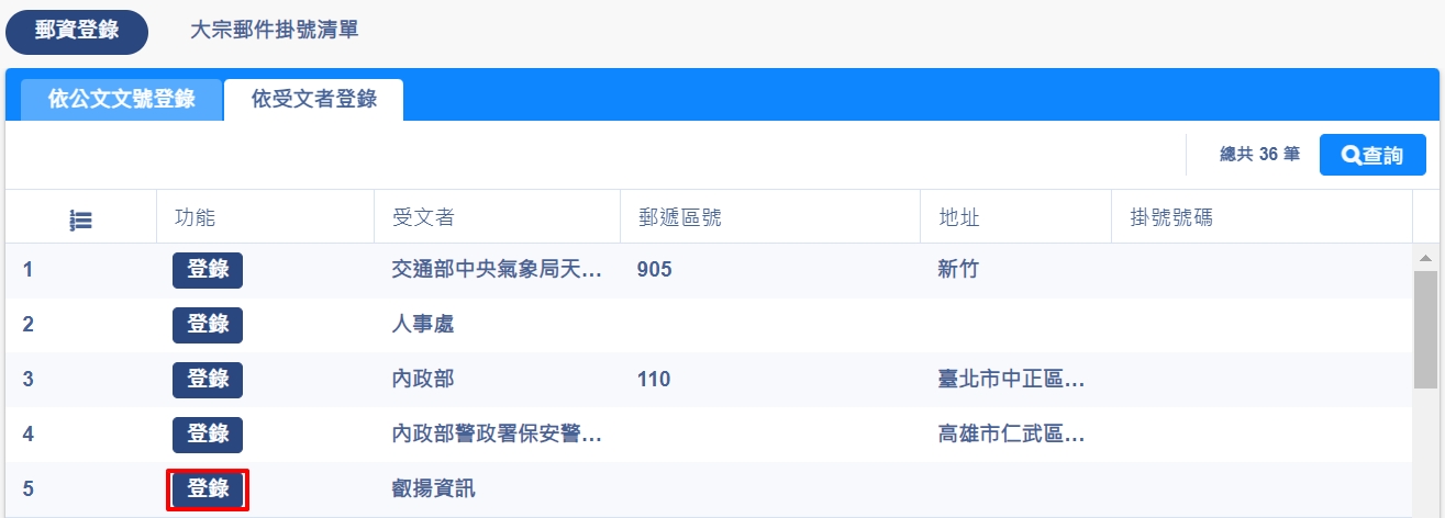 2. 查出受文者後,點選【登錄】,可於畫面下方檢視到該受文者所有符合查詢條件,且有進行紙本發文的公文資料。