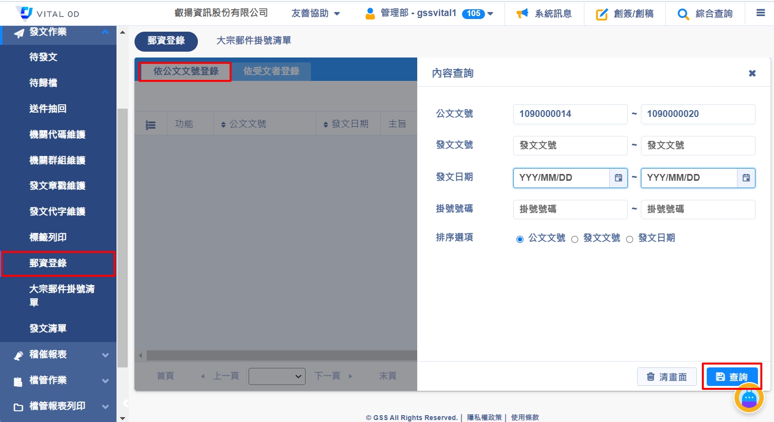 1. 發文人員可於【發文作業>郵資登錄>依公文文號登錄】,依公文文號查出紙本發文的公文資料,輸入查詢條件,點選【查詢】。