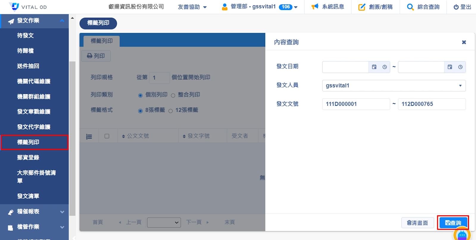 發文人員於【發文作業>標籤列印】,可列印出所有紙本發文受文者的地址標籤,輸入查詢條件後,點選【查詢】