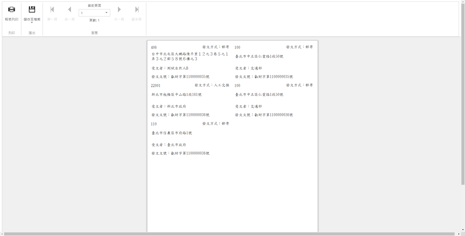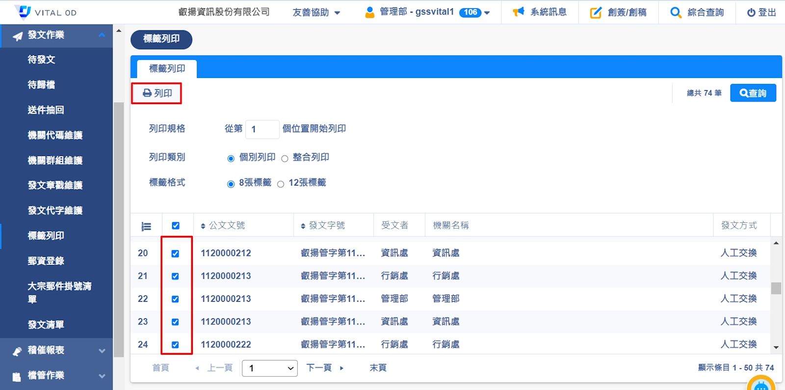 [列印格式]個別列印:每筆文號及受文者的標籤都會分開列印