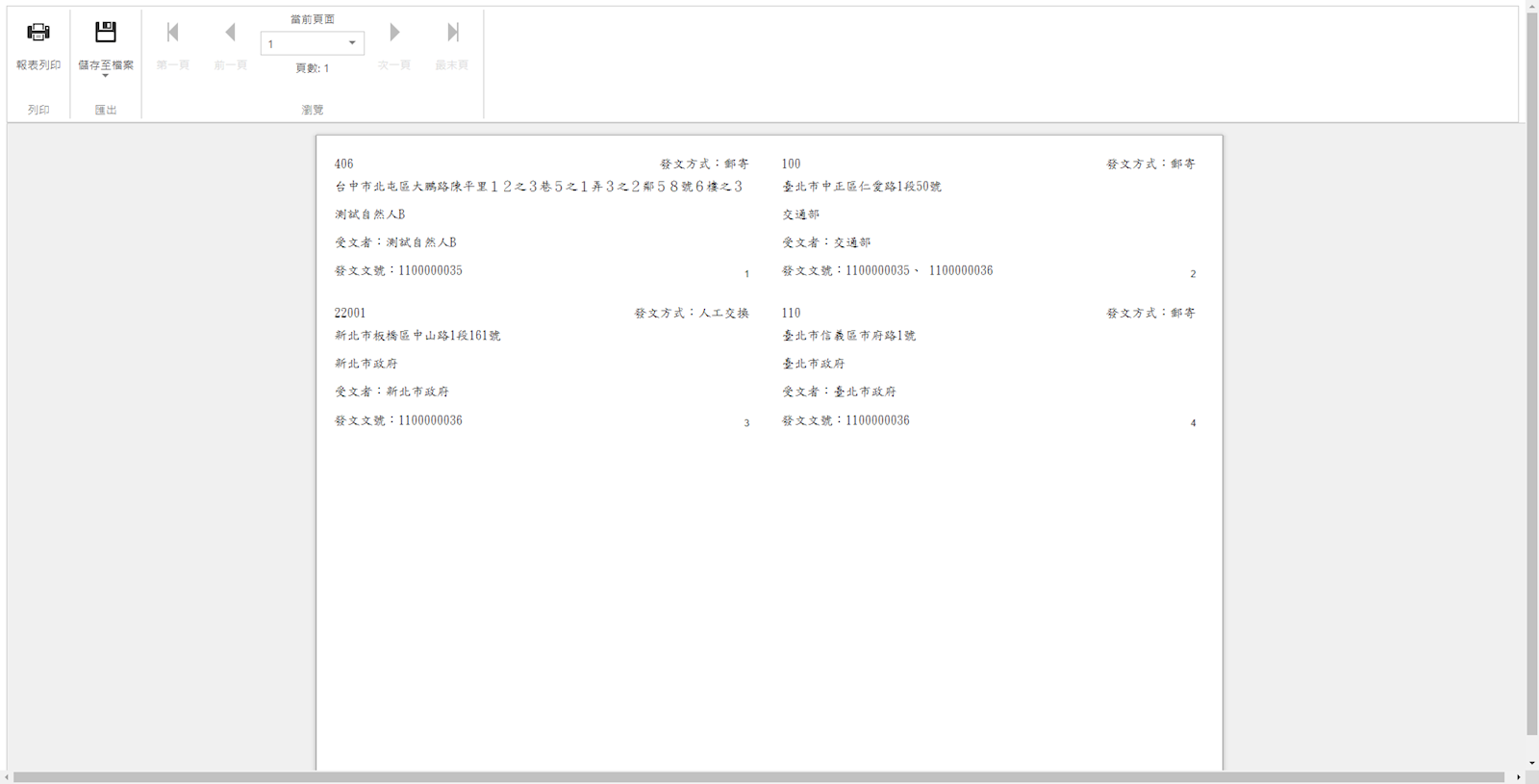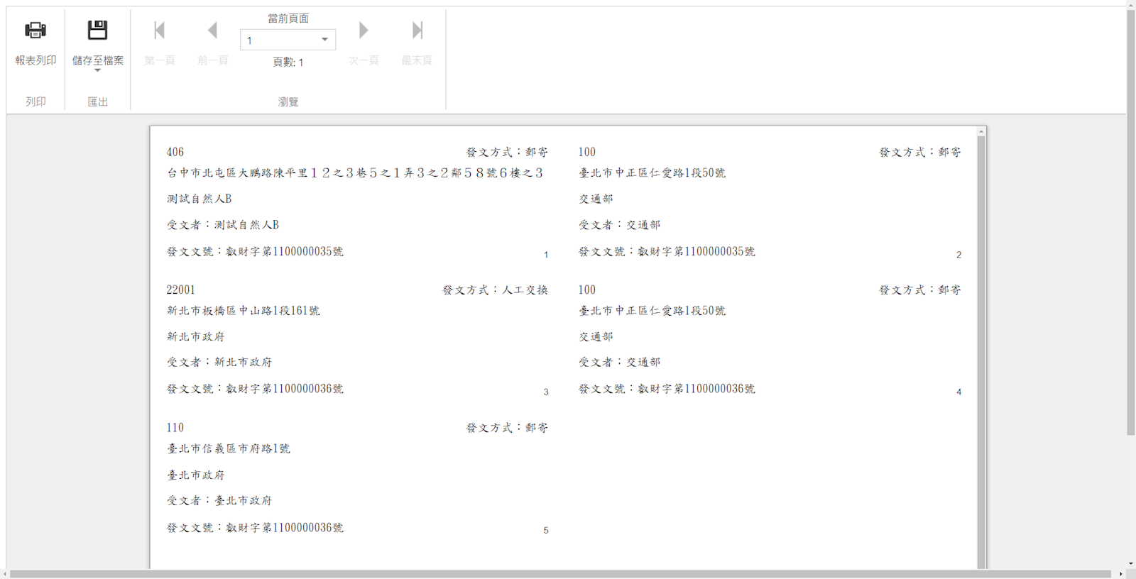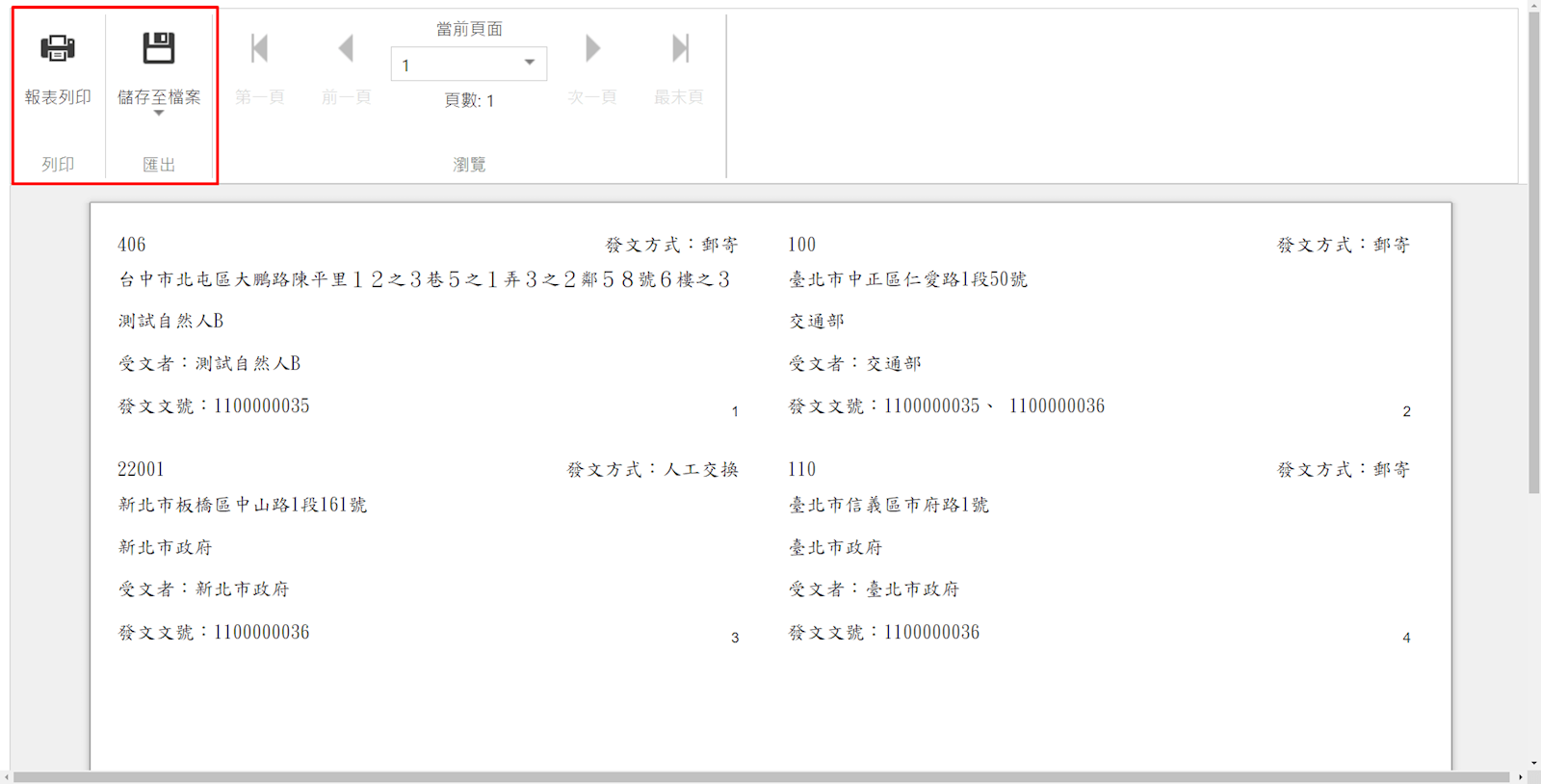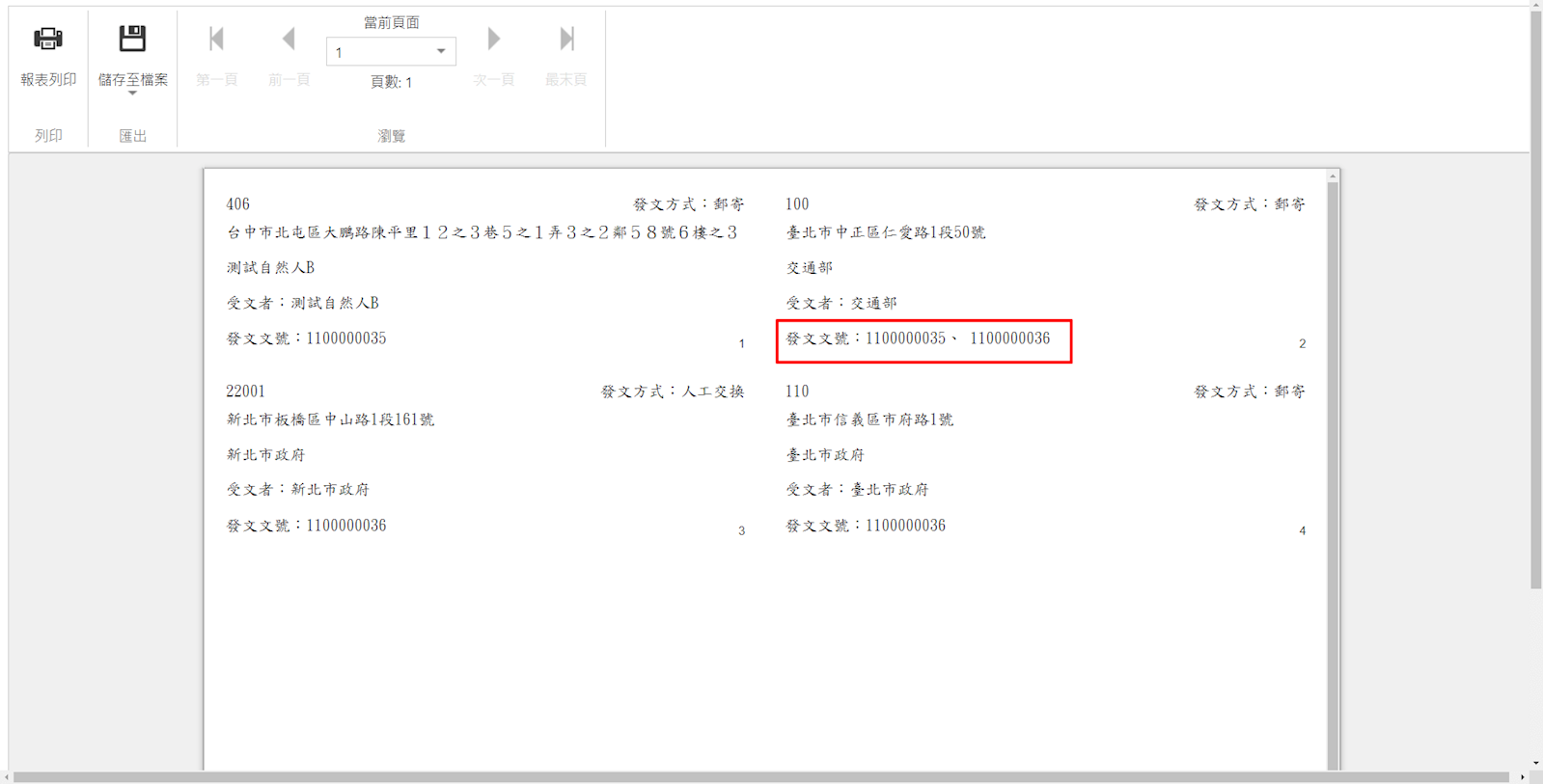 [列印格式]整合列印:多筆文號,相同的受文者會列印在一張標籤(如圖紅框處呈現多筆文號)