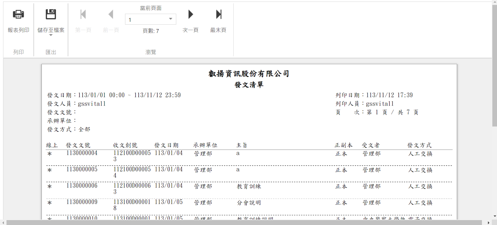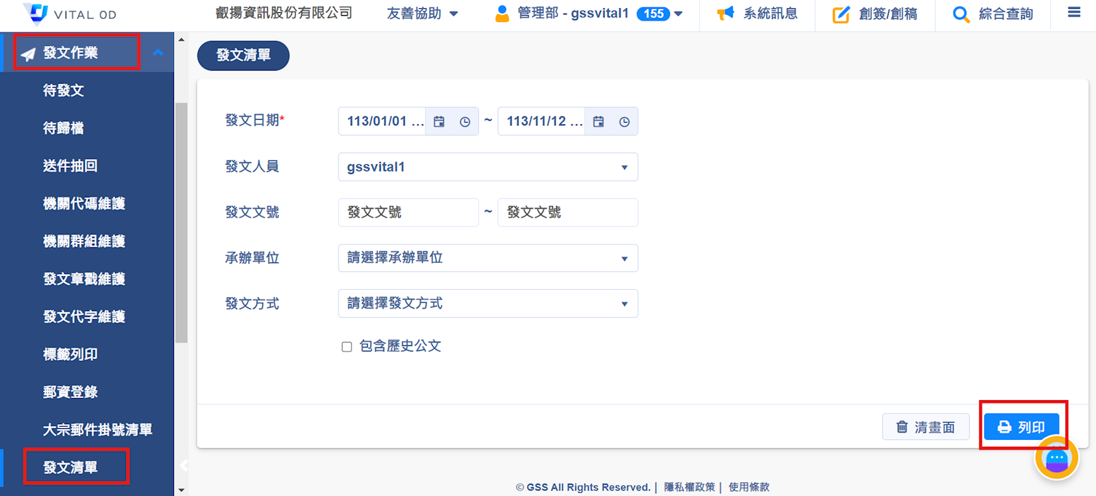 請點選【發文作業>發文清單】,輸入搜尋條件後(發文日期為必填),再按【列印】。
