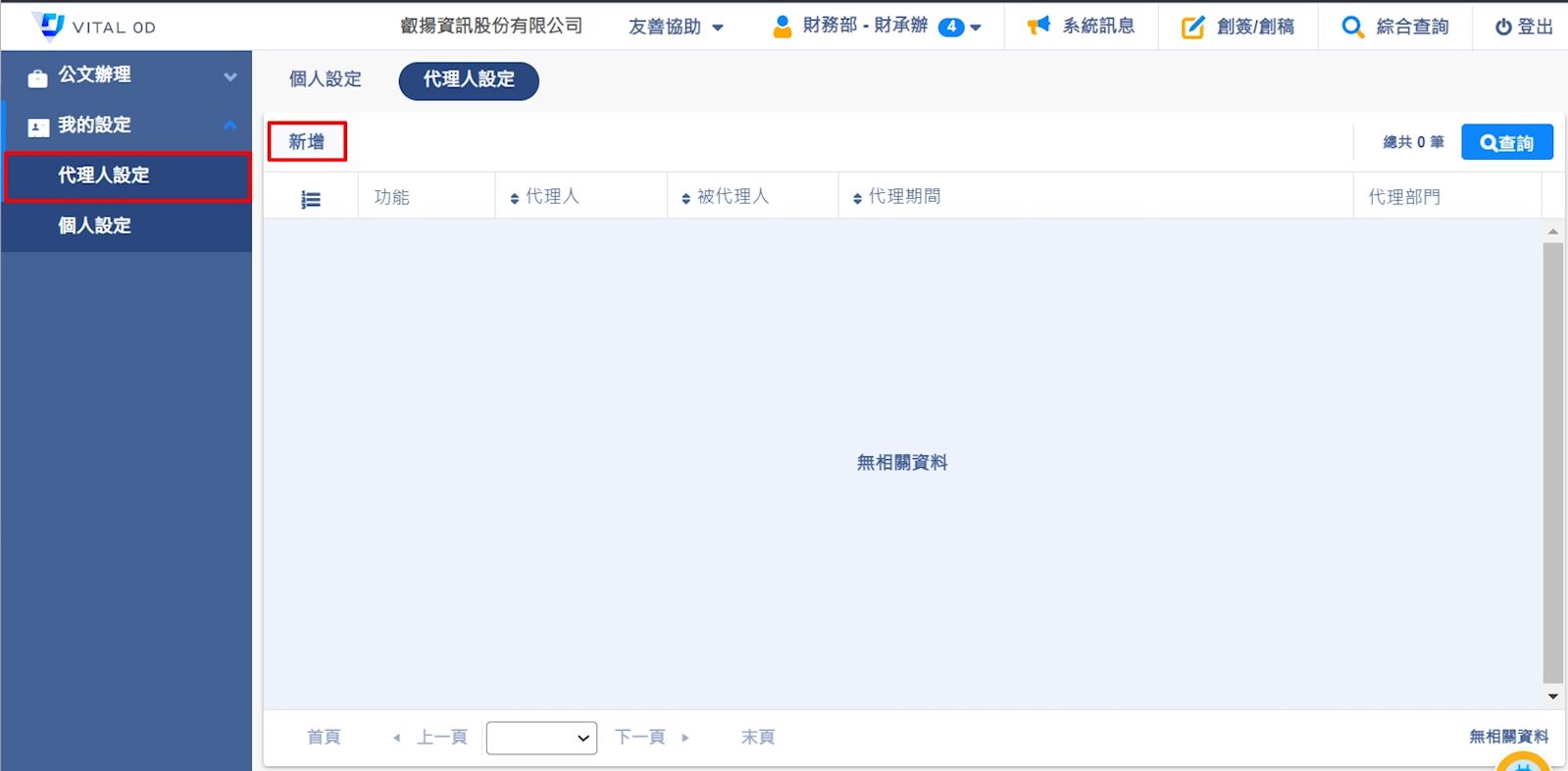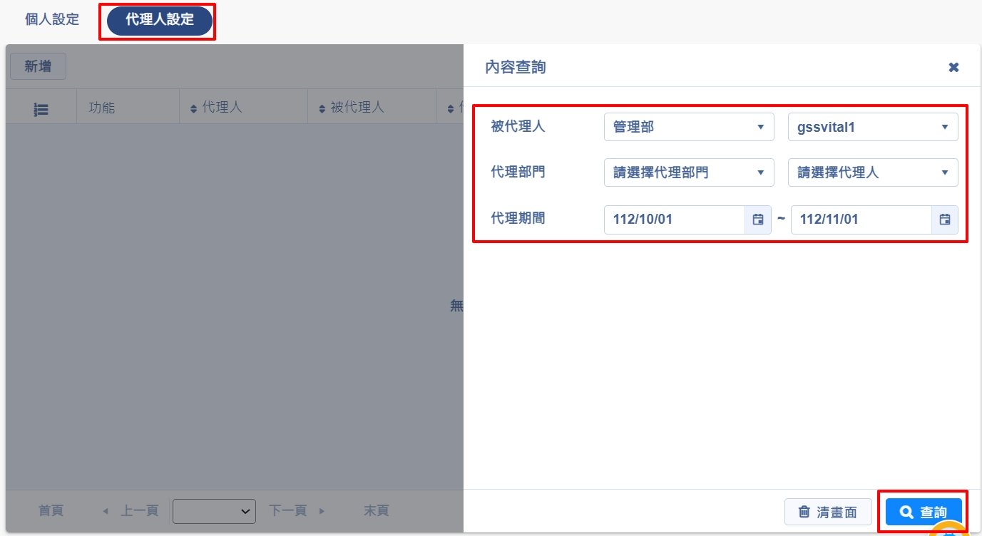 可在【我的設定>代理人設定】頁面中點擊【查詢】按鈕,查詢所有同仁的職務代理情形。