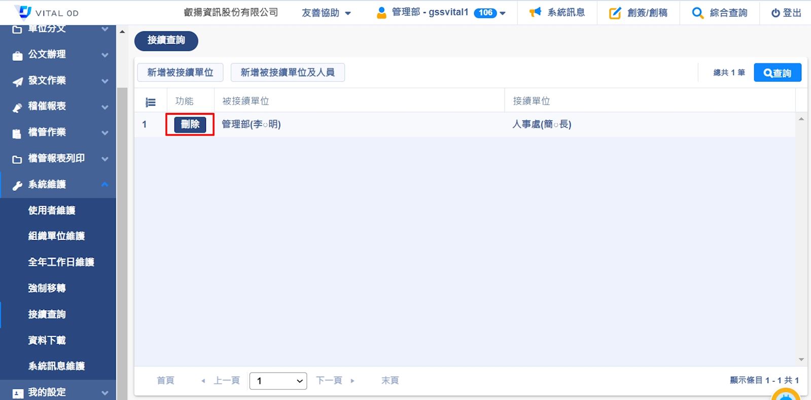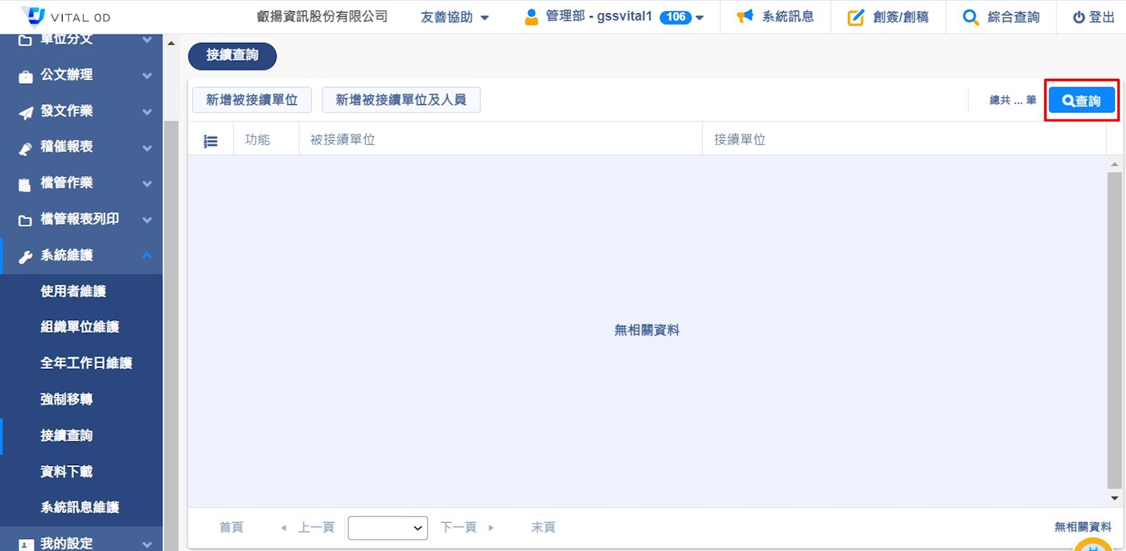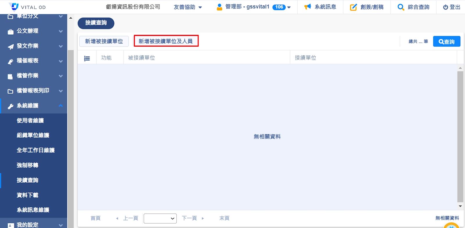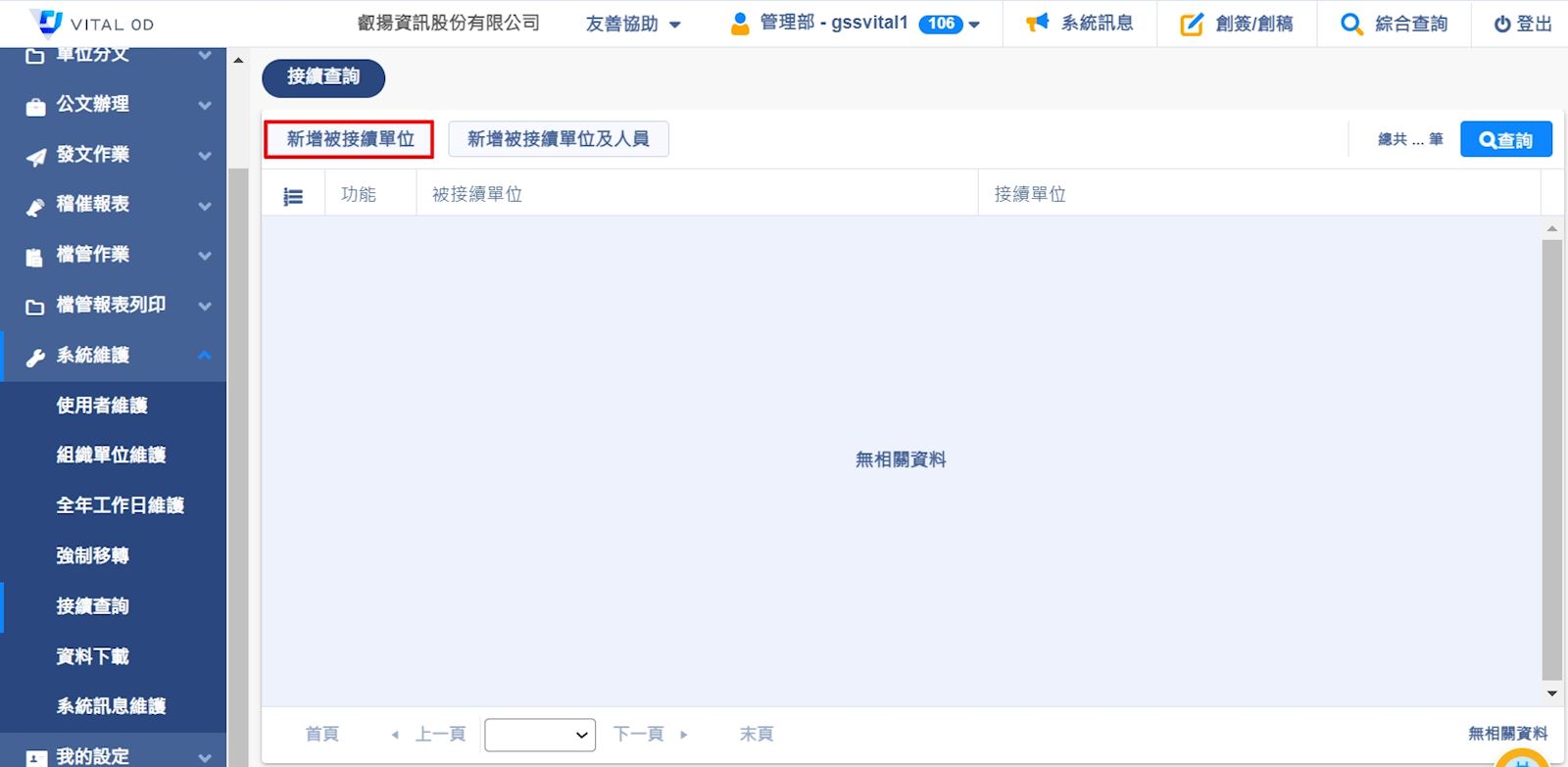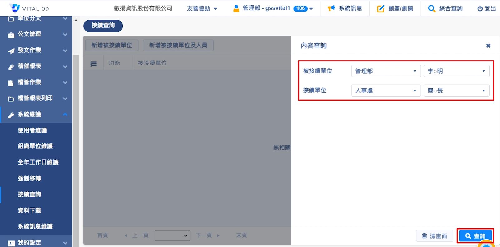 新增被接續單位: 請點選【系統維護>接續查詢】 ,若要將一個或多個已停用單位的查詢權限,設定給特定有查詢權限的人員,請點選左上方的【新增被接續單位】,並下拉選單選擇【被接續單位】而單位可選擇多個,接著請選擇有權限查詢的【接續單位及人員】,完成後【存檔】即可。 新增被接續單位及人員: 若要將已停用單位中人員的公文查詢權限,設定給特定有查詢權限的人員,請點選【新增被接續單位及人員】,下拉選單選擇【被接續單位】及【接續單位】,完成後請按存檔即完成接續設定。 刪除接續查詢: 若要刪除已存檔的接續設定,請點選右上角的【查詢】輸入查詢條件再點選下方的查詢,查出資料後請點下【刪除】即可。