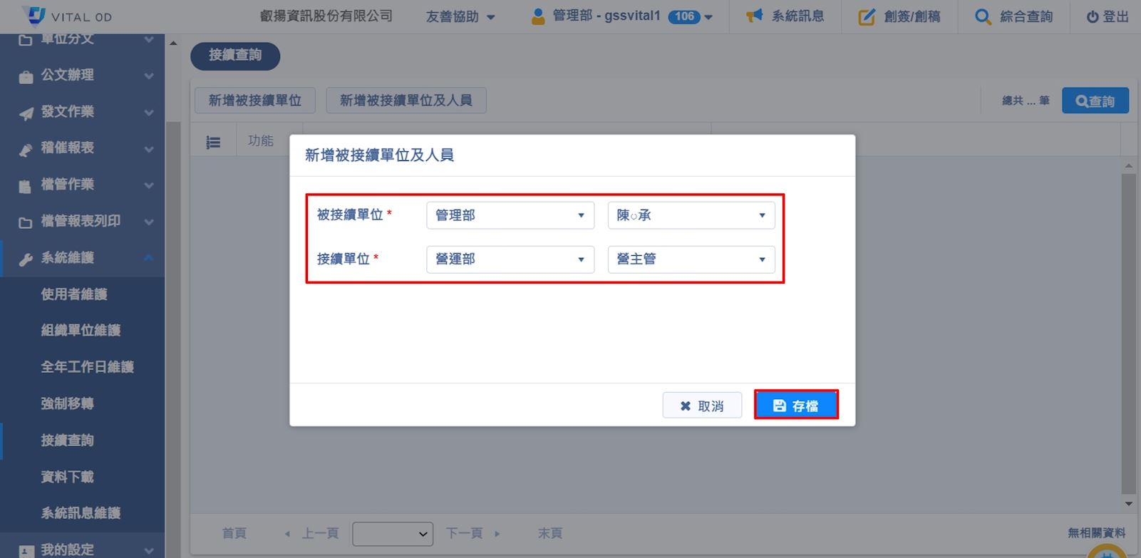 若要將已停用單位中人員的公文查詢權限,設定給特定有查詢權限的人員,請點選【新增被接續單位及人員】,下拉選單選擇【被接續單位】及【接續單位】,完成後請按存檔即完成接續設定。